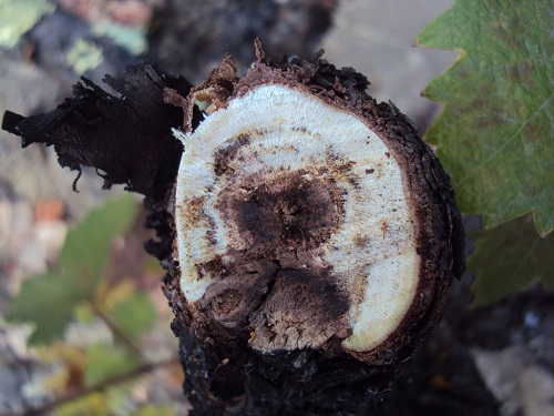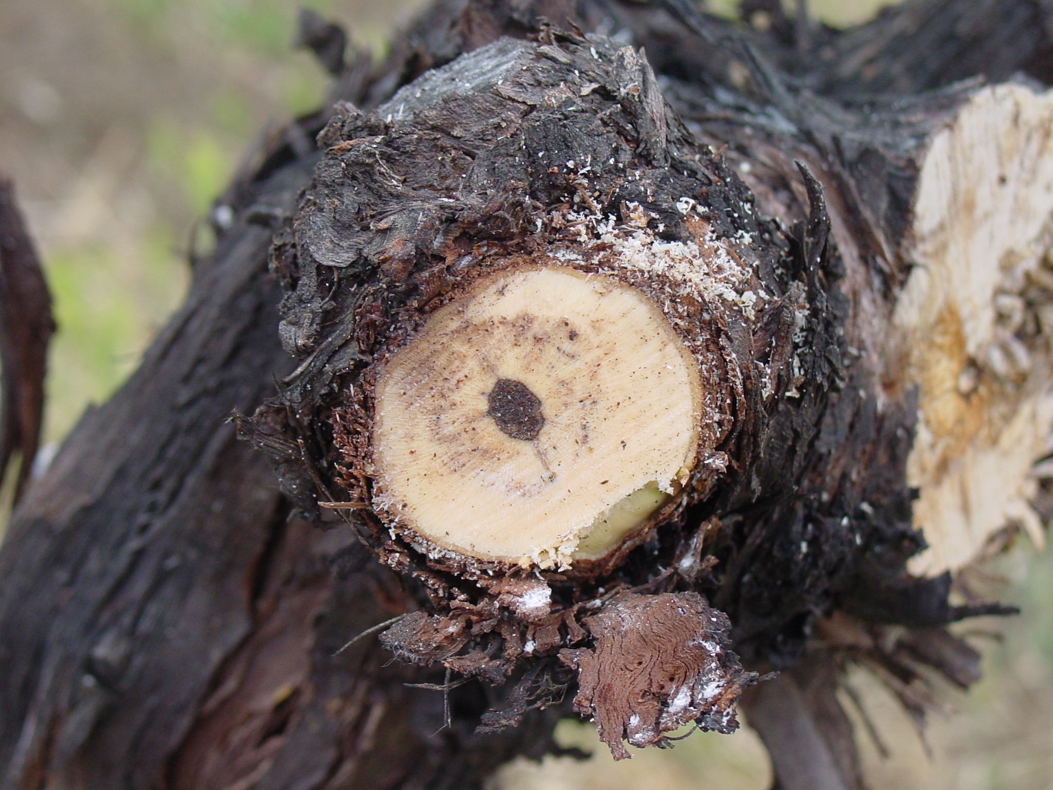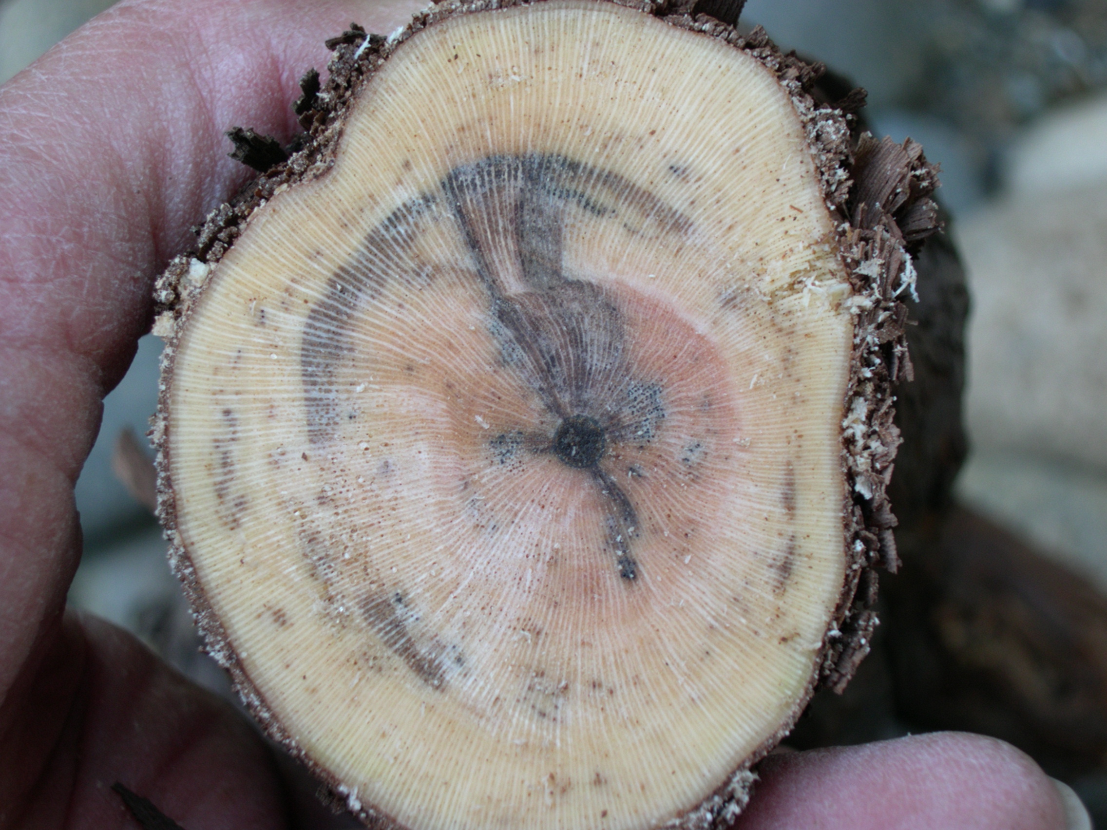 - Figure 9 – Concentric rings of black spots surround the pith, which is the naturally darkened core of this cordon. (Photo by Rhonda Smith).