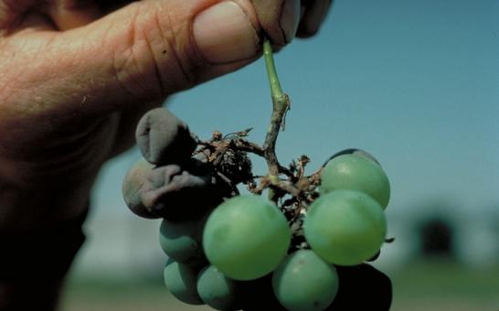 Lesions take over the rachis and berries mummify. Photo Credit http://www.oardc.ohio-state.edu/