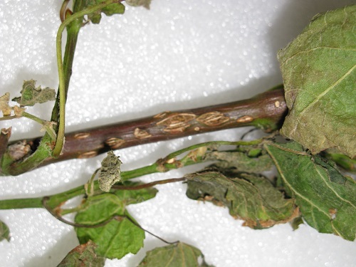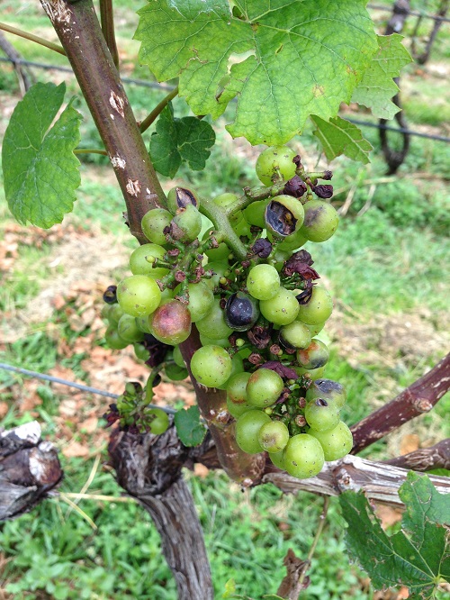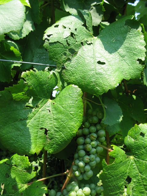 Hail damage can cause shot holes and ripping of leaves, scaring on shoots and reduce crop yield and quality. Check with local weather history for recent hail events.