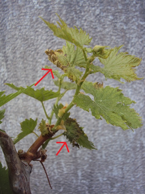 - Chlorotic and cuppled leaves, turn tattered in summer